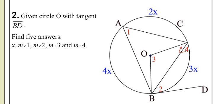 ∠ 1 = 0.5 × arc BC = 0.5 × 3x = 0.5 × 120° = 60°