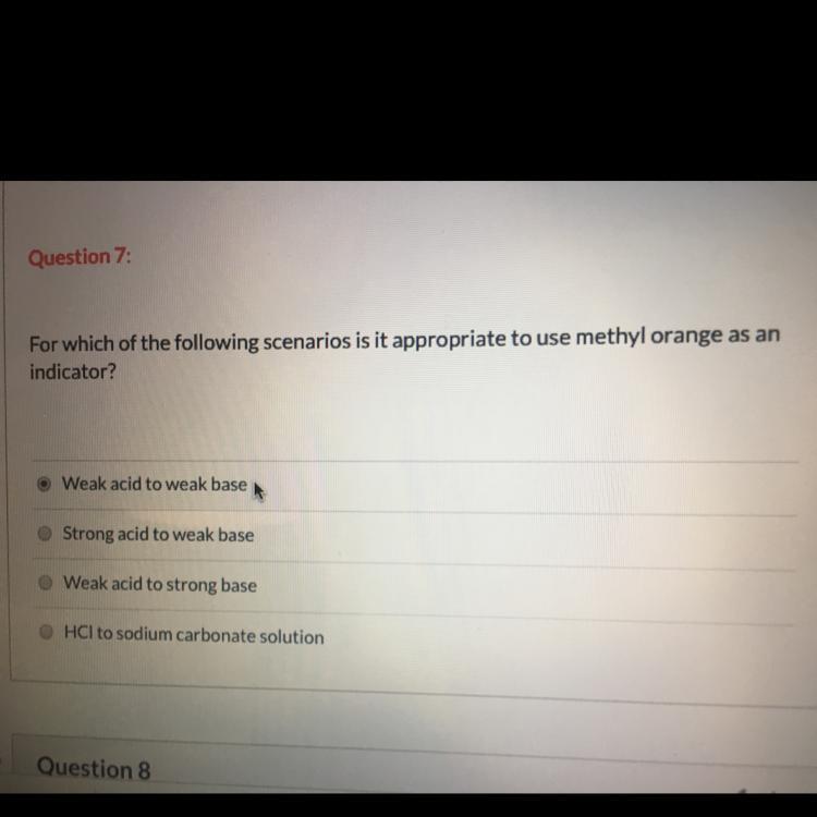 ⇒Methyl orange has an equivalence point, more or less at pH=4, ( so will change colour there). This is quite away from where the equivalence point of a weak acid with a strong base.