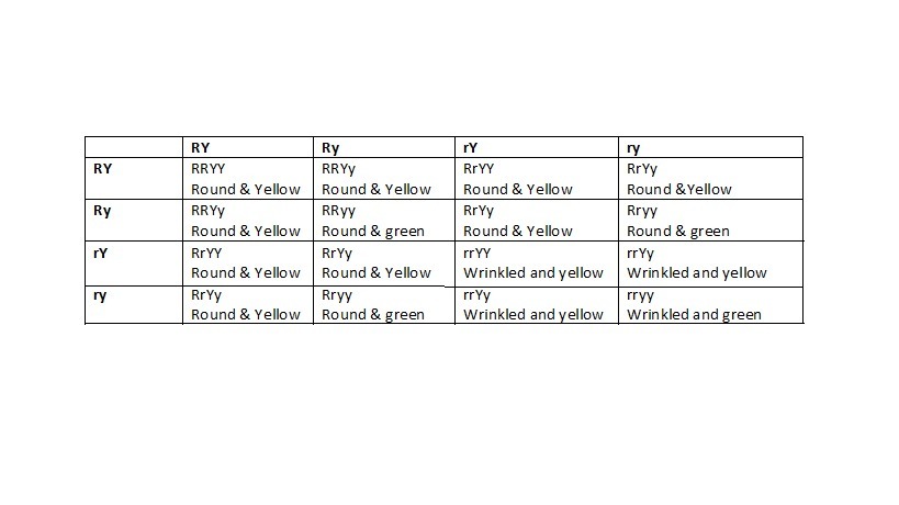 A dihybrid cross for round and yellow seeds can be represented as follows. The phenotype of the parents is plants with round and yellow seeds. Their genotype is RrYy. The gametes formes would be RY, Ry, rY and ry.
