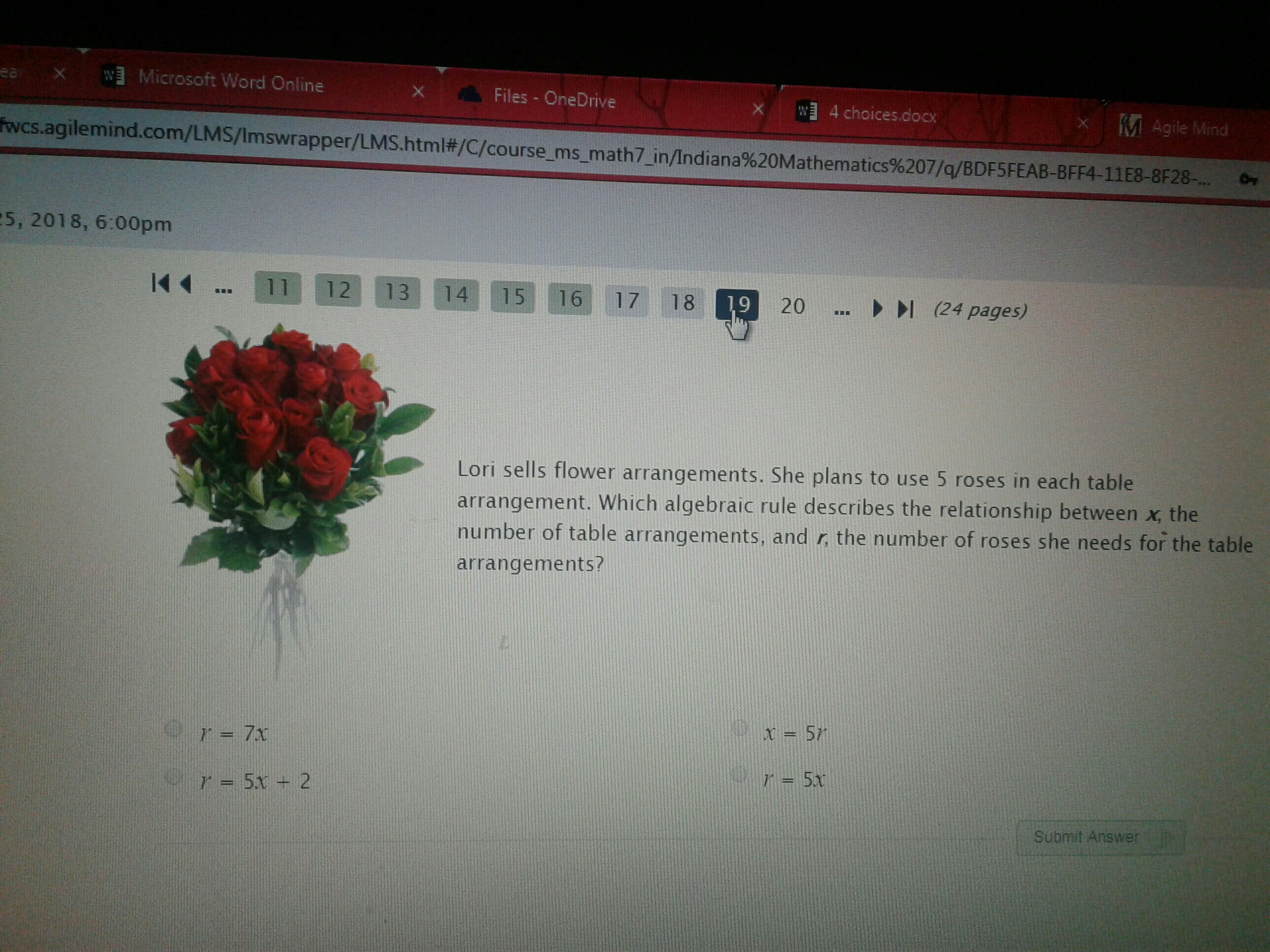 At this point, you probably see the pattern: you multiply 5 by the number of tables to get the total number of roses. So it would look like this equation