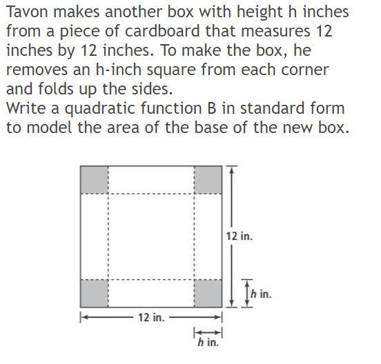 ![Area = 12[12 - 2h] -2h [12 - 2h]](https://tex.z-dn.net/?f=Area%20%3D%2012%5B12%20-%202h%5D%20-2h%20%5B12%20-%202h%5D)
