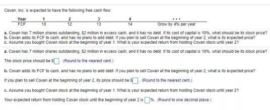 in excess​ cash, and it has no debt. If its cost of capital is ​, what should be its stock​ price? b. Covan adds its FCF to​ cash, and has no plans to add debt. If you plan to sell Covan at the beginning of year​ 2, what is its expected​ price? c. Assume you bought Covan stock at the beginning of year 1. What is your expected return from holding Covan stock until year​ 2? a. Covan has million shares​ outstanding, ​$ million in excess​ cash, and it has no debt. If its cost of capital is ​, what should be its stock​ price?