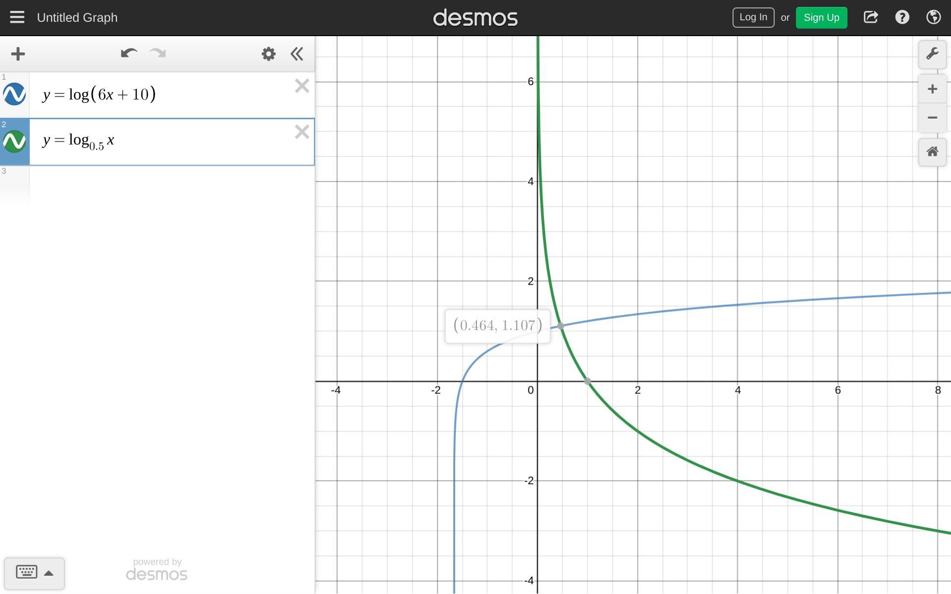 If the equation below is solved by graphing, which statement is true? log (6 x + 10) = log Subscript one-half x Answer choices: