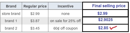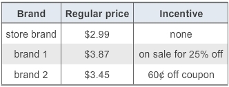 s for different brands - first column Brand, second column Regular price, third column Incentive. First row Brand store brand, Regular price 2 dollars and 99 cents, Incentive none. Second row Brand brand 1, Regular price 3 dollars and 87 cents, Incentive on sale for 25 percent off. Third row Brand brand 2, Regular price 3 dollars and 45 cents, Incentive 60 cents off coupon. A. store brand B. brand 1 C. brand 2