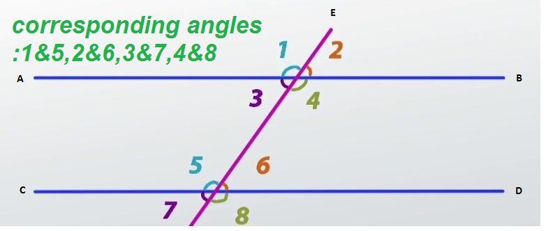Corresponding Angles: angles ∠1 & ∠5, ∠2 & ∠6, ∠3 & ∠7,∠4 & ∠8