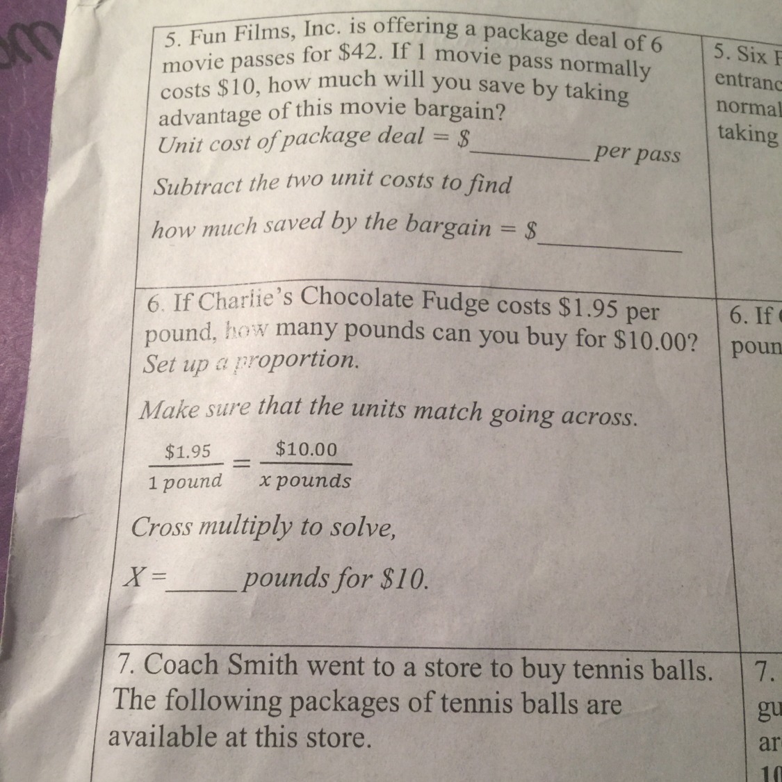 5. if 6 movie passes is $42, then to get the cost of one pass we do 42/6 = $7