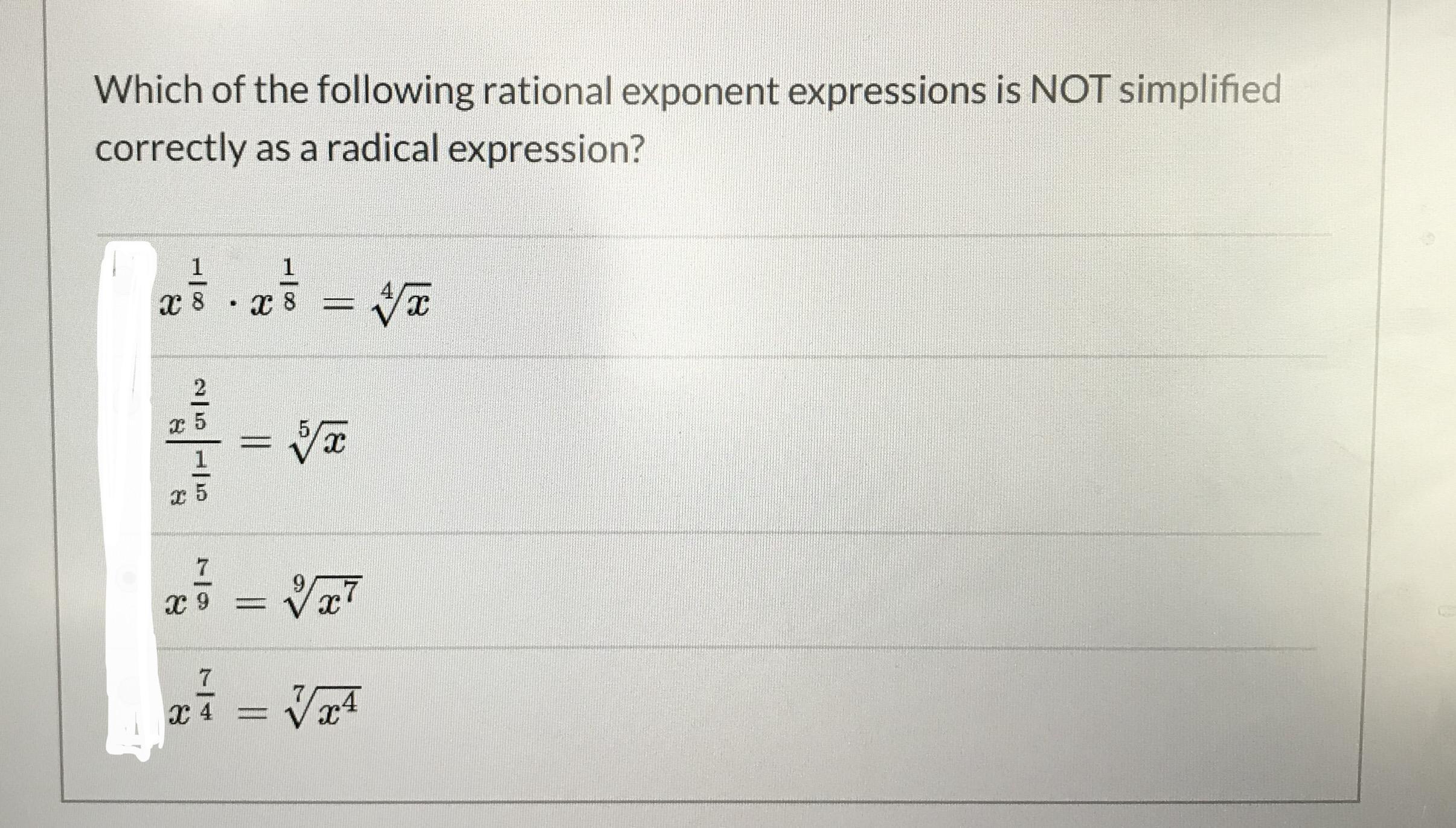 So, solving given expression: ![x^{(\frac{7}{4})} = \sqrt[4]{x^7} \neq \sqrt[7]{x^4}](https://tex.z-dn.net/?f=x%5E%7B%28%5Cfrac%7B7%7D%7B4%7D%29%7D%20%3D%20%5Csqrt%5B4%5D%7Bx%5E7%7D%20%20%5Cneq%20%20%5Csqrt%5B7%5D%7Bx%5E4%7D)