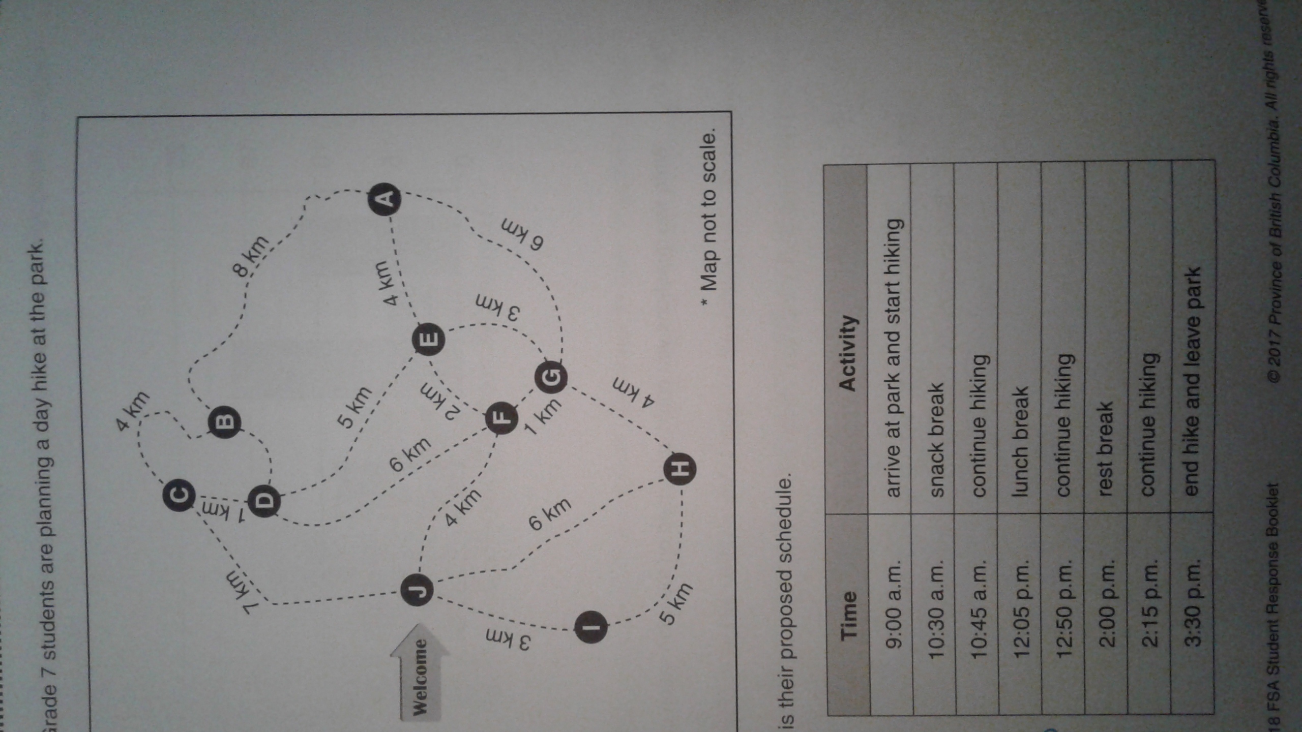 If the students are hiking at 4 km/h, you'll need to use the schedule to find <em>the total number of hours they spent hiking</em> and multiply it by that rate. According to the activity column, how many time chunks are they hiking for, and how long does each of them last? You can use that information to help answer the question.
