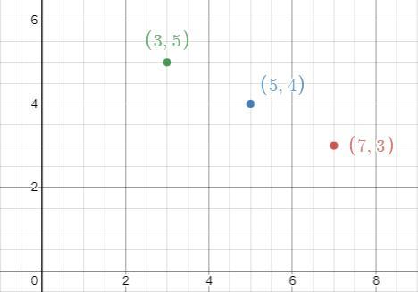 Skye, the red dot, sat down first at (7, 3). That is our first point. Then, Angelica, the blue dot, sat down exactly between Skye, who is located at (5, 4), and Jason, whose coordinate pair is unknown. You will have to reflect the dots over the blue dot. I just counted the numbers using rise-over-run from the blue dot to the red dot. The change in X was +2, and the change in Y was -1. If we're reflecting, we have to reverse these actions. Start back at the blue dot and subtract 2 from the x-axis, then add 1 to the y-axis. You will get to Jason's seat, located at (3, 5).