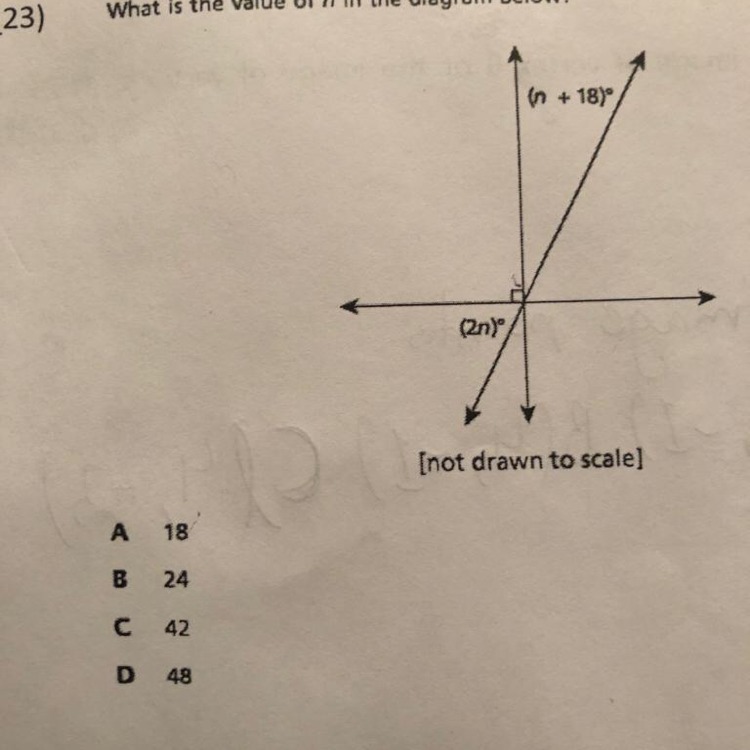 From your picture, 2n and the angle beside it must add up to 90° (marked in green in 2nd attached picture). The angle beside it, using the vertical angle theorem must be equal to (n+18)°. That means 90 - 2n = n+18 (or 90 - (n+18) = 2n, either works). Solve for n: