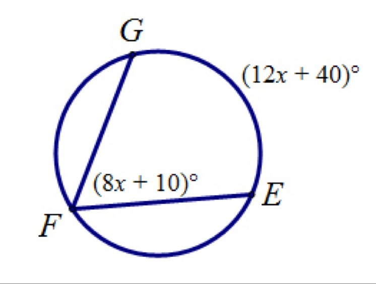 The inscribed angle is 8 x+10 and it has to be half of the arc 12x+40 we ca write as