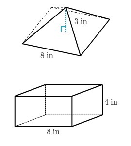 To find the combined volume, you will find the volume of each figure separately and then add them together. You will use the formulas for each polyhedra (3-D) shape. V = 1/3 Bh (pyramid); B stands for the area of the base of the figure V = 1/3 x 8 x 8 x 3 V = 64 cubic inches V = Bh (prism) 8 x 8 x 4 V = 256 cubic inches 256 + 64 = 320 cubic inches The total volume of the box is 320 cubic inches.