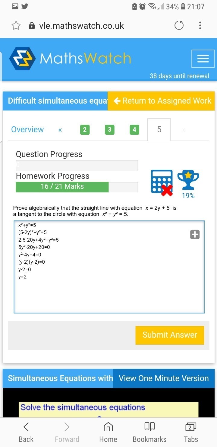 (y + 2 )² = 0 ⇒ y = - 2 and x = (2 × - 2 ) + 5 = 1