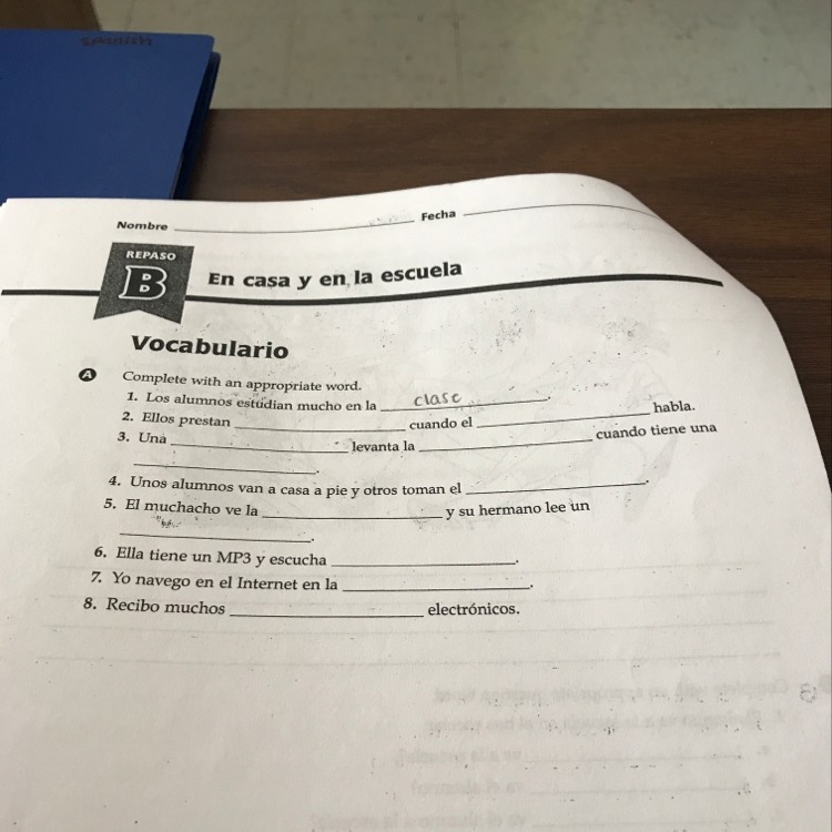 2. Ellos prestan atencion cuando el professor habla. 3. Una estudiante levanta la mano cuando tiene una pregunta. 4. Unos alumnos van a casa a pie, y otros toman el autobus. 5. I honestly have no idea what this could be. 6. Ella tiene in MP3 y escucha musica. 7. Yo navego en el Internet en la escuela. 8. Recibo muchos correos electronicos.