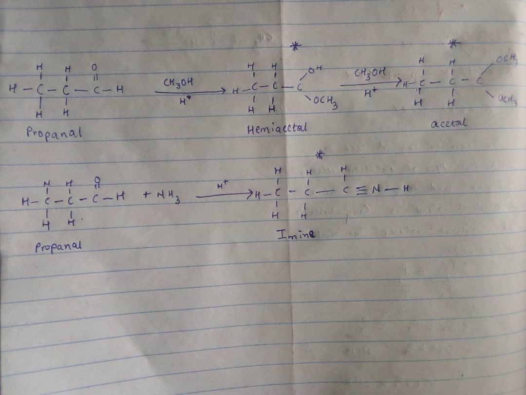 The diagram for hemiacetal, acetal and imine is shown in the diagram below and a star is placed on the three of them since they are all form in acidic solution.