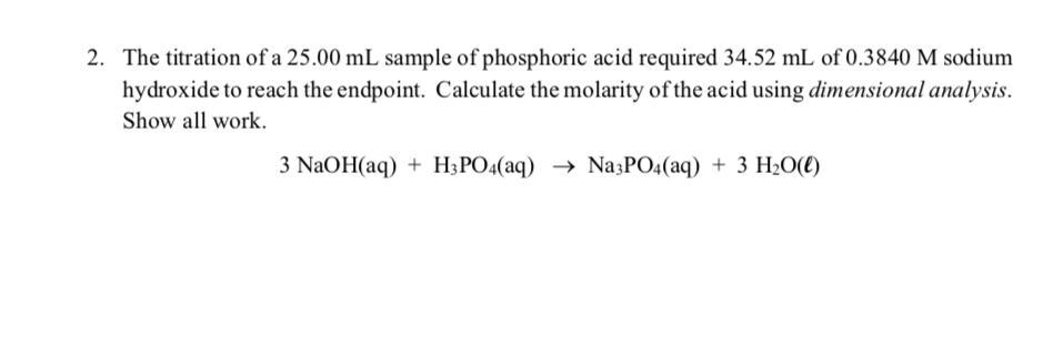 \text{Moles of  NaOH} = \text{34.52 mL NaOH} \times \dfrac{\text{0.3840 mmol NaOH}}{\text{1 mL NaOH}} = \text{13.26 mmol NaOH}