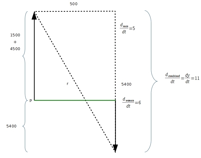 the man is going North, and he has a rate of 5 f/s, she's going south, 500 miles from P, the green distance, and she's going 6 f/s.