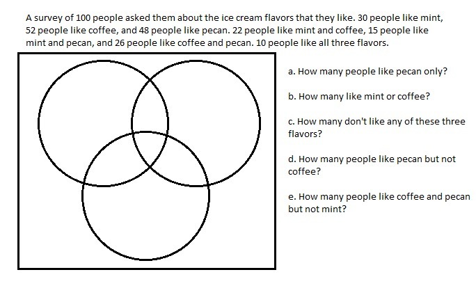 15 like mint and pecan so write 5 where those two circles intersect (15 - 10 = 5, remember that 10 are already included in both circles)