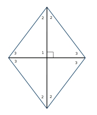 since the rhombus has 4 congruent triangles, we can check any of those, keeping in mind that the sum of their interior angles must be 180°. So whatever ∡2 and ∡3 are, they must add up to 90, and ∡2 being the smaller one.