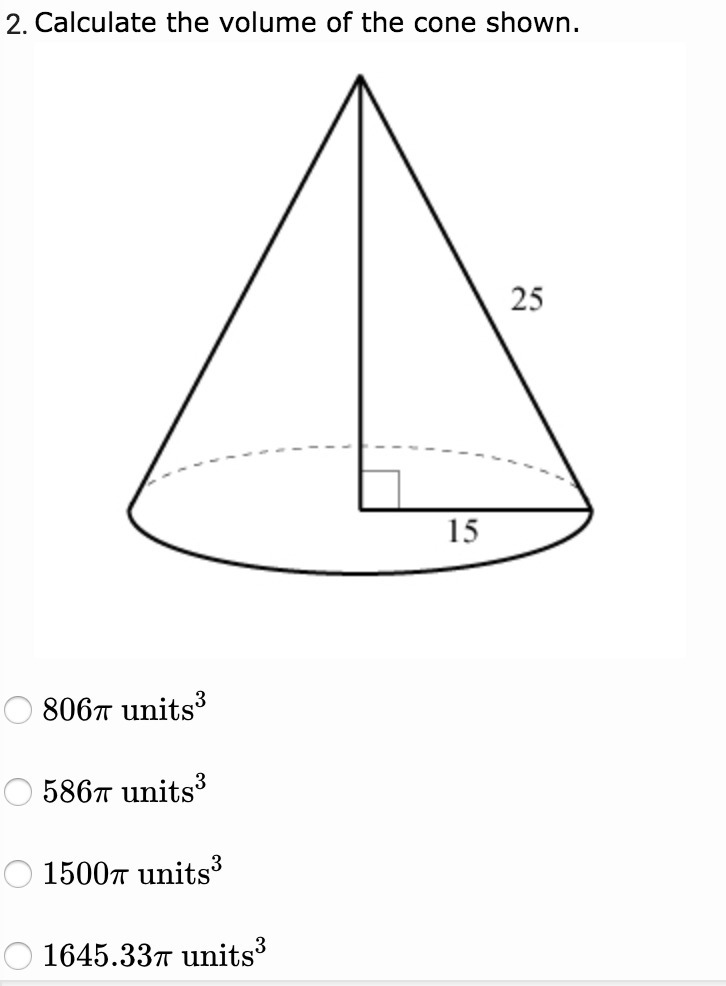 Next, multiply 225 and 20/3, and your answer will be V = 1500π, or the third option.