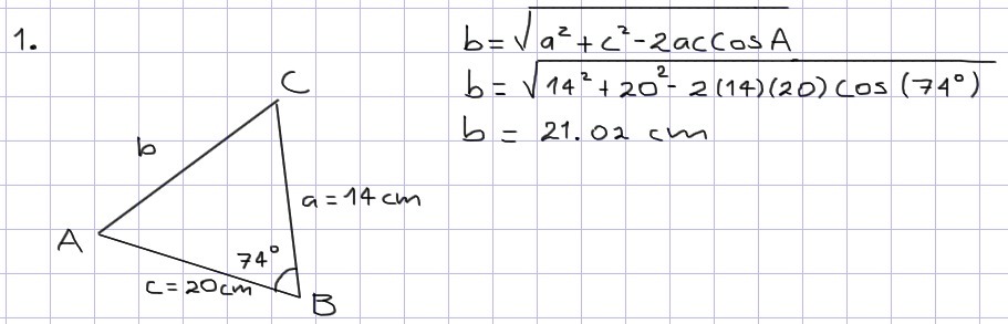 1. First, we are going to draw our triangle (picture 1). Next, we are going to use the cosine rule to find the length of side