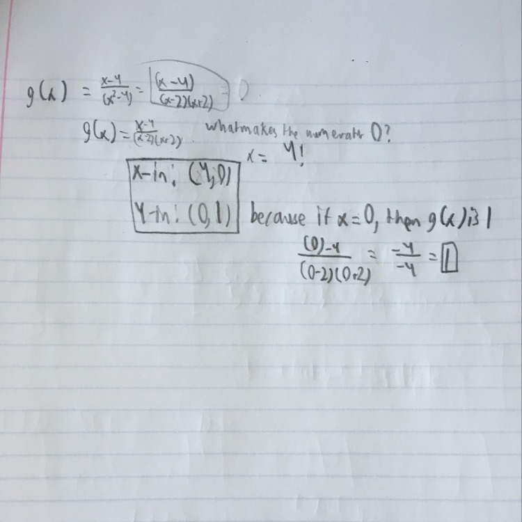 Y intercept occurs when x = 0 so its 0-4 / 0- 4 = 1 coordinates of y intercept is (0,1) x intercept occurs when y = 0 (x -4) / (x^2-4) = 0 x-4 = 0 x = 4 x intercept at (4,0)