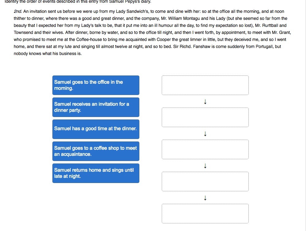 Explanation: In the passage provided, <u>what first takes place is Samuel receiving an invitation for a dinner party.</u> Then,<u> he spends all the morning in his office before going to the dinner at noon</u>. He has a great time at the dinner. After it, he goes to his office again and then to <u>a coffee shop in order to meet an acquaintance</u>. Finally, Samuel returns home and <u>sings there until almost twelve at night.</u>