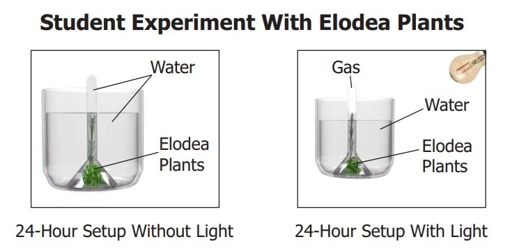 light caused the Elodea plants to photosynthesize, releasing O2 gas. Choice A is not true as if gravity increased the downward flow of the water, then the model without light should have air accumulated in the test tube too. In Choice B, while it is true that the plant may have absorbed the dissolved CO2 in water, this does not explain why there is gas on top of the test tube. Choice C may only evaporate the water, not cause the escape of dissolved gases. In choice D, however, light caused the Elodea plants to perform photosynthesis releasing O2 gas compared to the other model without light wherein the plant cannot perform photosynthesis thereby not releasing O2 gas therefore no gas is seen on top of the test tube.