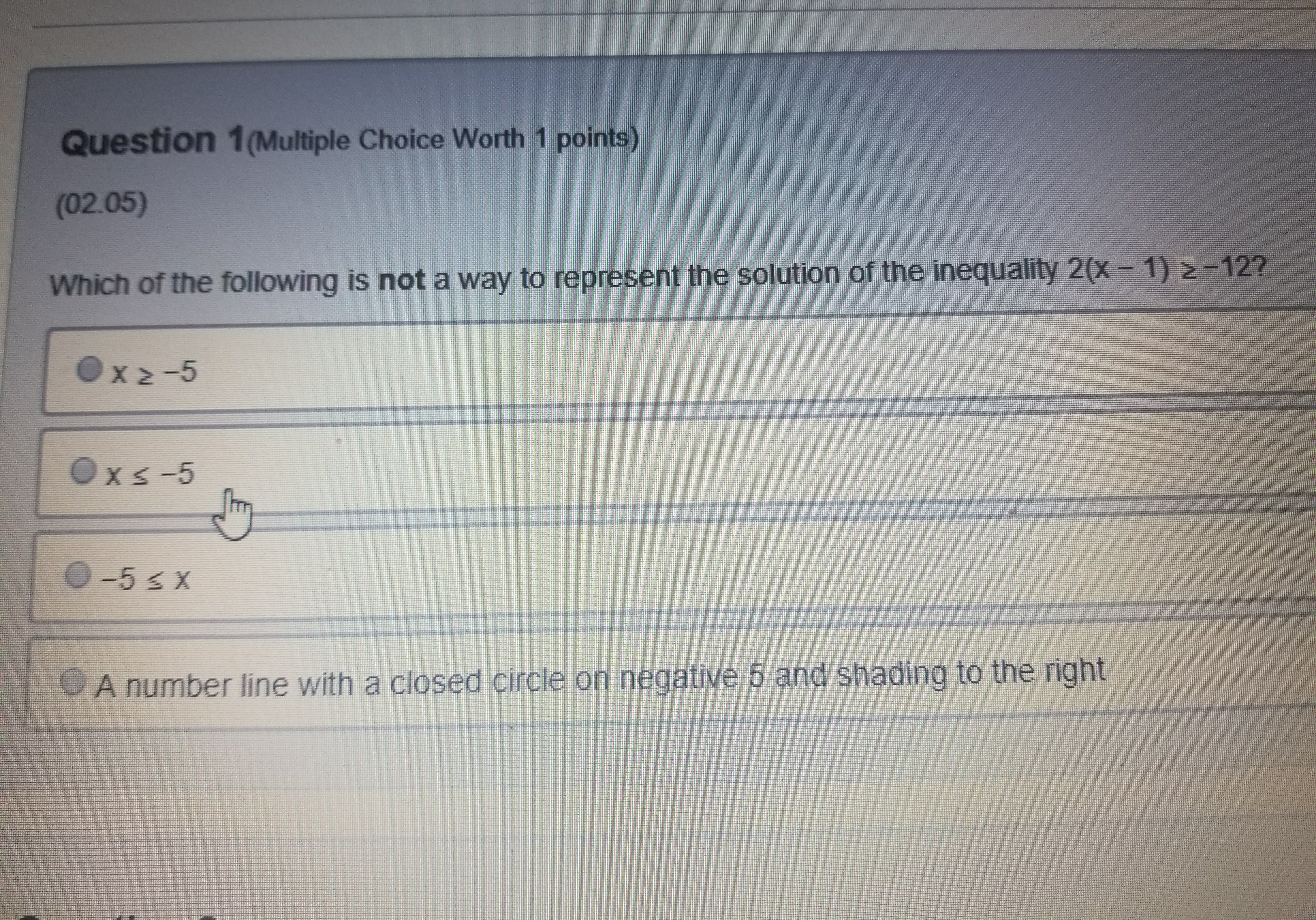 Solve both sides out and you'll get 2x - 2 \geq -12. This is the same as x \geq -5 or -5 \leq x. So the answer is the second one.