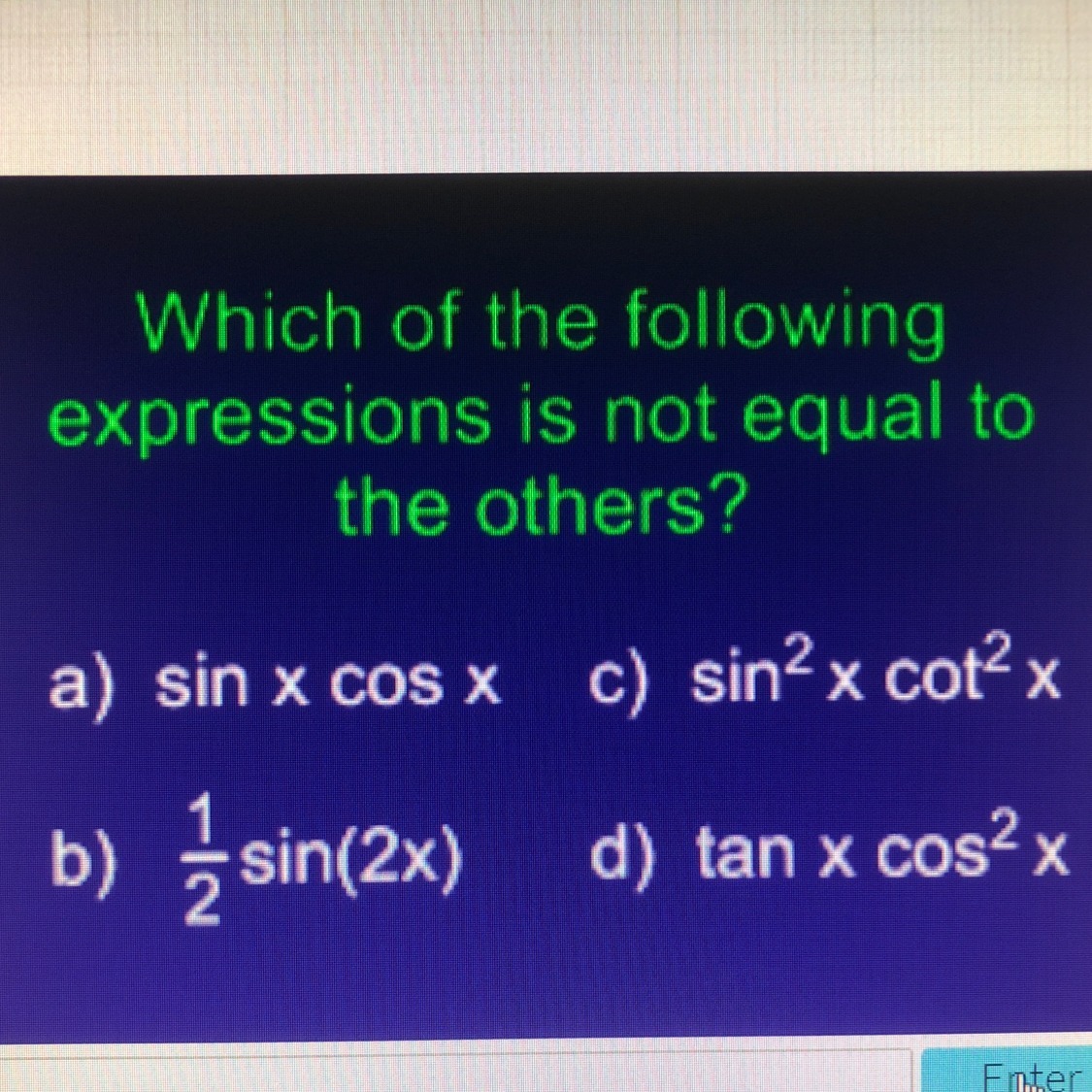 a)\ \sin x\cos x\\\\b)\ \dfrac{1}{2}\sin(2x)=\dfrac{1}{2}\cdot2\sin x\cos x=\sin x\cos x\\\\c)\ \sin^2x\cot^2x=\sin^2x\cdot\dfrac{\cos^2x}{\sin^2x}=\cos^2x\\\\d)\ \tan x\cos^2x=\dfrac{\sin x}{\cos x}\cdot\cos^2x=\sin x\cos x\\\\Answer:\ c).