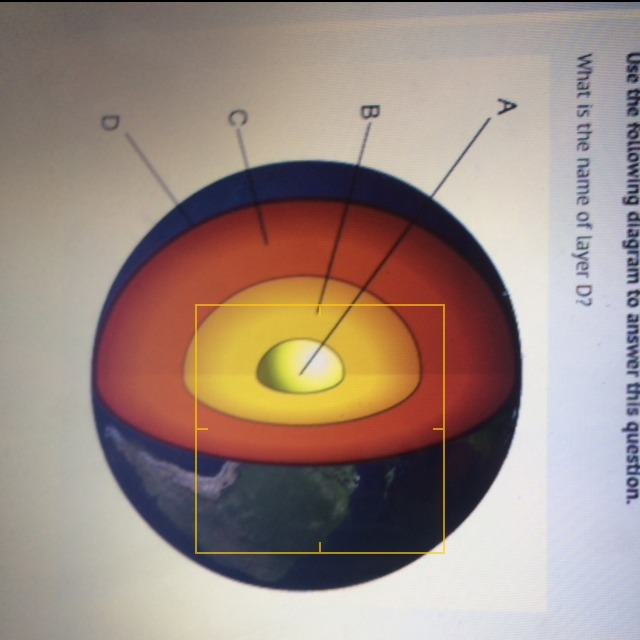 In the given picture the layer D depicts the crust. The earth crust can be define as the outermost solid hard part covering the geosphere. The earth's crust is hard outer part of earth. It is composed of rocks such as sedimentary, metamorphic, and igneous. The crust is of two types such as continental crust (it lies under the land) and the oceanic crust (it lies under the ocean). The continental crust is thick whereas the oceanic crust is thin.