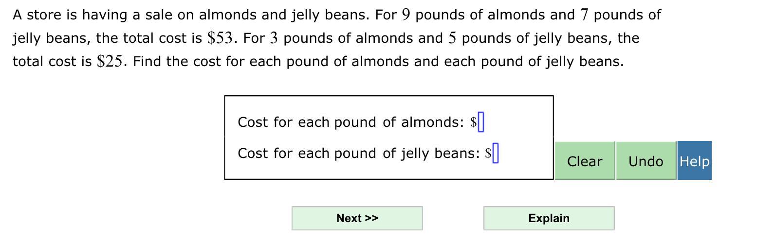 The cost of each pound of almonds: $3.75