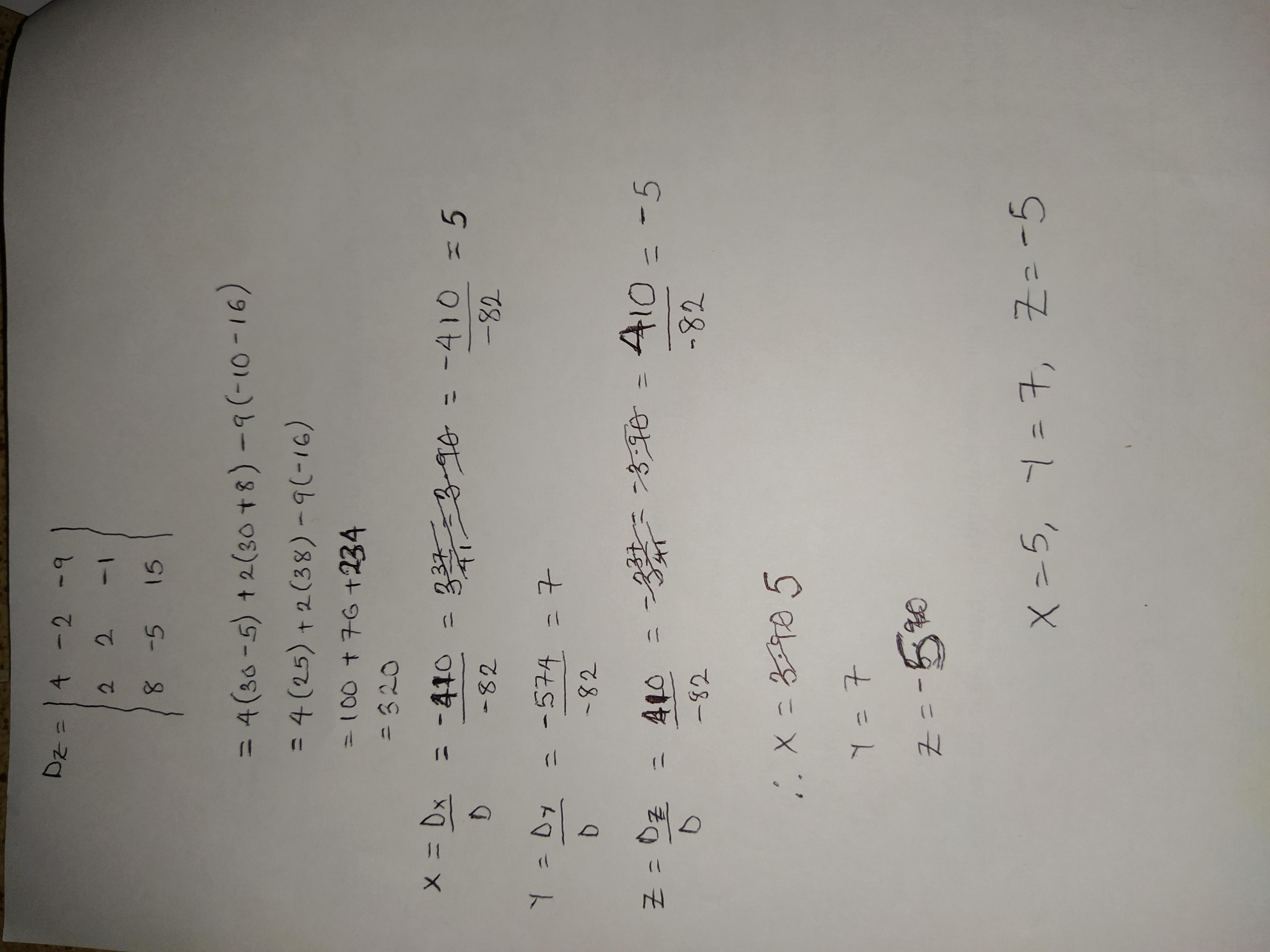 Dy =\left[\begin{array}{ccc}4&-9&3\\2&-1&5\\8&15&-2\end{array}\right]          Dz =\left[\begin{array}{ccc}4&-2&-9\\2&-2&-1\\8&-5&15\end{array}\right]