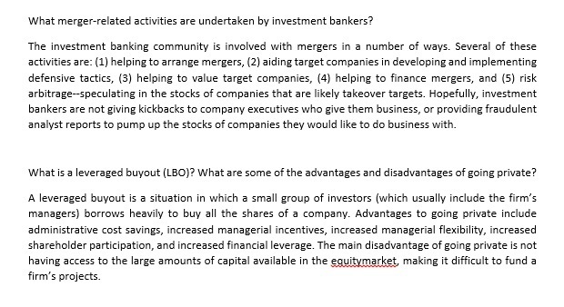 What merger-related activities are undertaken by investment bankers? what is a leveraged buyout (lbo)? what are some of the adva