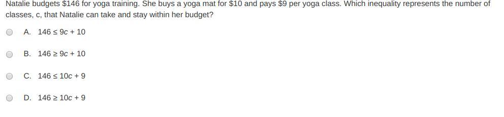 Natalies budget is $146. This means she can spend less than or exactly $146 on yoga training. So, we will be using the less than or equal to symbol. It looks like this: ≤.