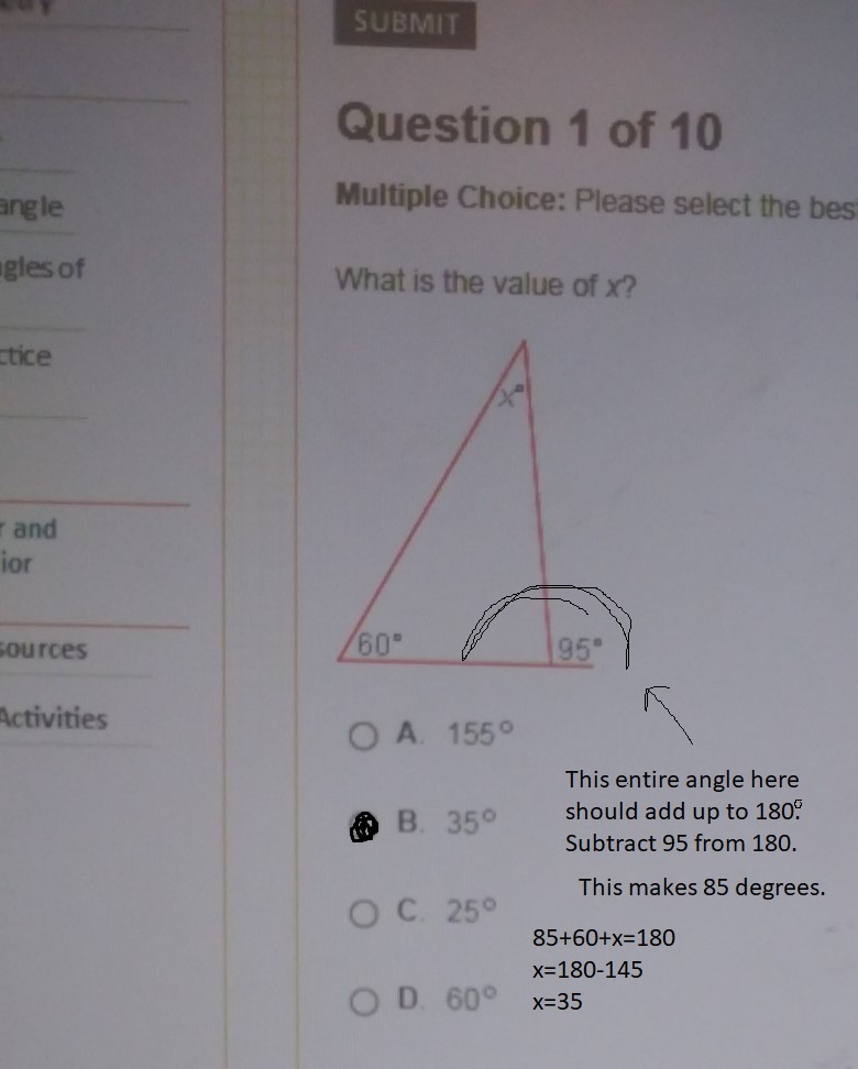 The answer is B. 35, because if the exterior angle is 95 degrees, this makes the angle on the inside 85, so that they both add up to 180 degrees. All the angle measure of a triangle add up to 180, so 60+85= 145. 180-145= 35 degrees. Hope this helped.