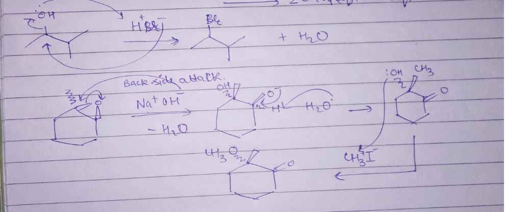 In the first reaction it is normal nucleophilic substitution reaction on the addition of hydrobromide. Hindu second reaction first the Hydroxide Ion attacks on the tertiary carbon because it is more reactive then the anion formed is further converted into carbonyl. And on the addition of methyl iodide we get the required product.