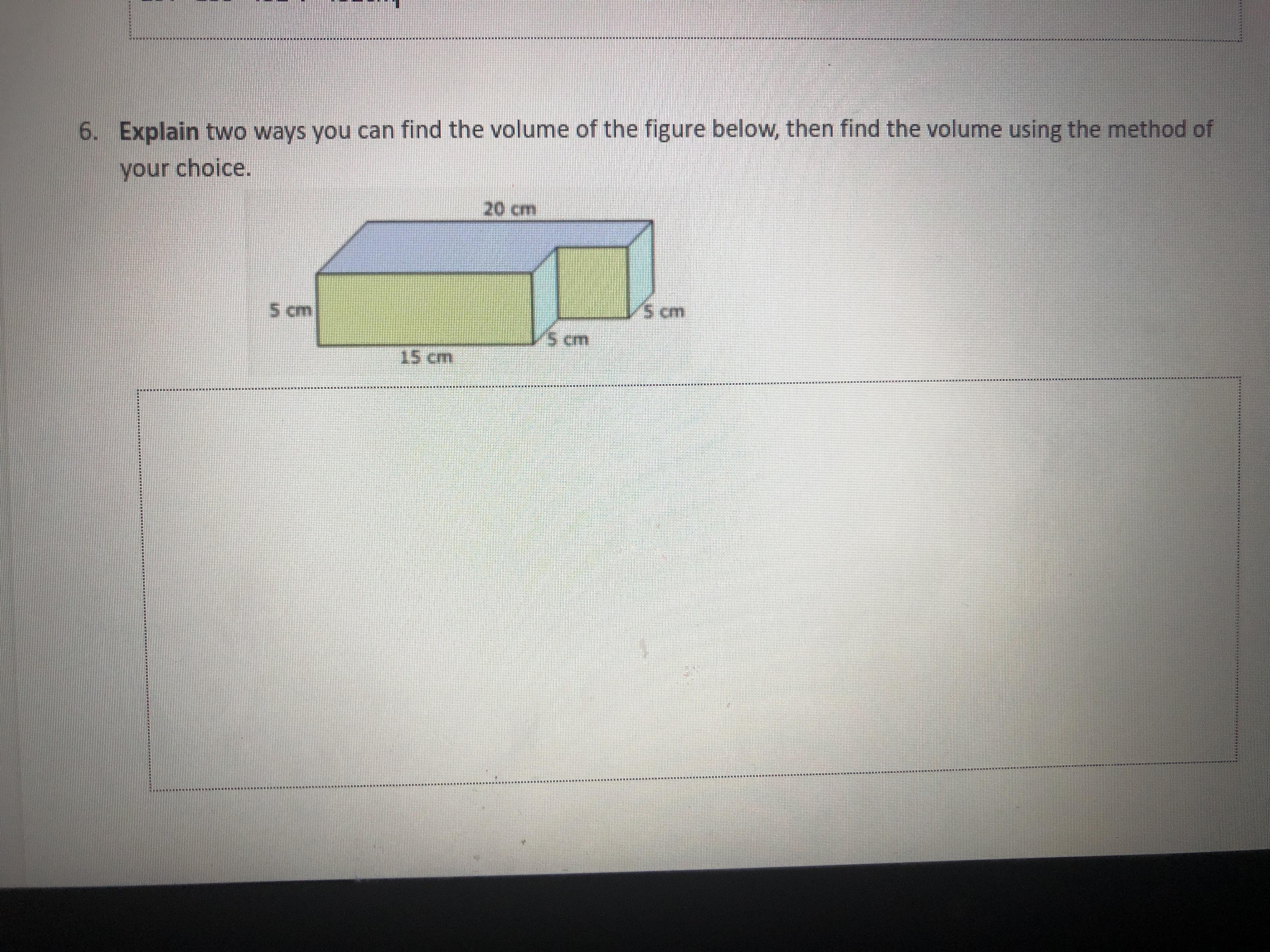 This method is done by finding the volume of a 5*20*10 prism (the 10 comes from the two 5s on the right), and then subtracting a 5*5*5 cube.