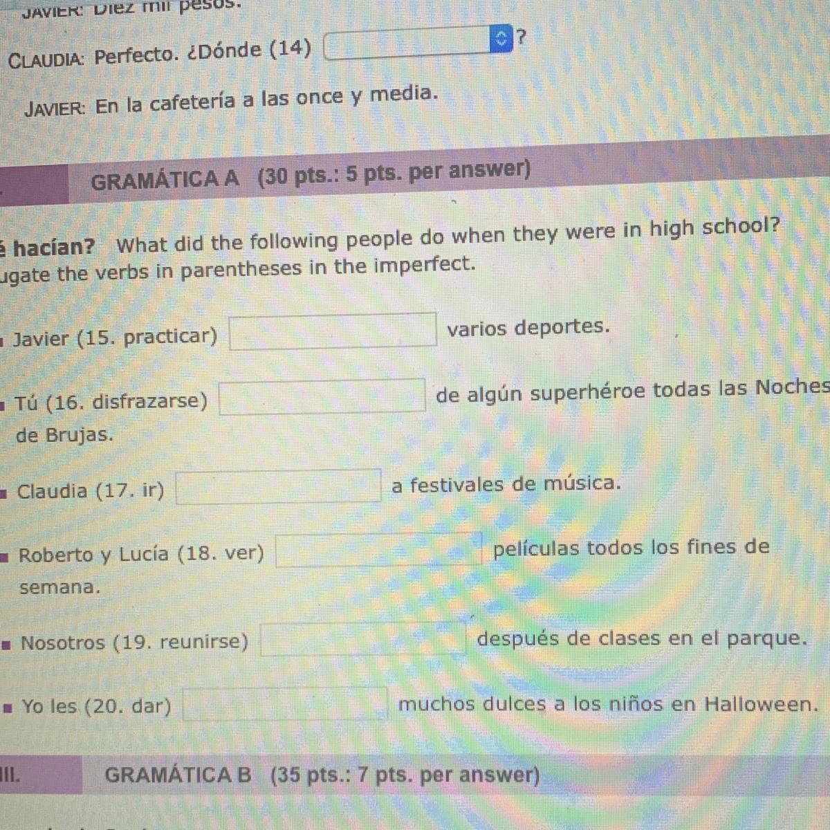Javier *practica* muchos deportes. Tu *te disfrazarás* de algún súper héroe todas las noches de brujas. Claudia *ira* a festivales de música. Roberto y lucia *verán* películas todos los fines de semana. Nosotros *nos reunimos* después de clases en el parque. Yo les *daré* muchos dulces a los niños en Halloween.