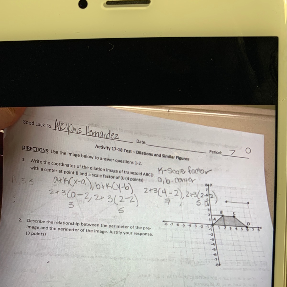 For the first question, we can extend all of the lines on the trapezoid, and triple the distance from B on the line, so we can use the fact that B is (2, 2), A is (0, 0), C is (4, 2), and D is (6, 0) to get that the new coordinates are A (-4, -4), B (2, 2), C (8, 2), and D (14, -4).