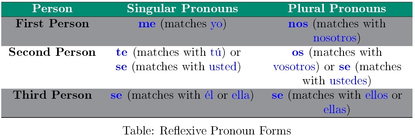 We use Reflexive verbs when someone performs an action <em>to</em> or <em>for himself/herself.</em> In other words, the <em>subject</em> of the verb and the <em>direct object</em> of the verb are the same person.This verb is always accompanied by a Reflexive Pronoun. These pronouns are indicated in the Table below. Therefore: