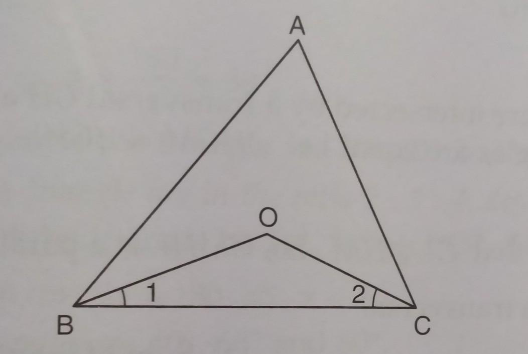 or, angle A + 2(angle 1) + 2(angle 2) = 180° [Since BO and CO are the bisectors of angle ABC and angle ACB respectively, then, angle B = 2(angle 1) and angle C = 2(angle 2)]