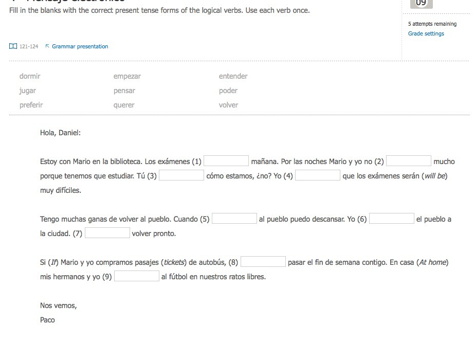 Carlos: Necesito pedirles algo a ti y a tu hermano antes de que tu padre y yo (1) regresemos de nuestro viaje. Les ruego que (2) limpien las ventanas. También necesito que tú (3) pases la aspiradora por la alfombra del pasillo. Es importante que tu hermano (4) sacuda su estante. ¡Tiene mucho polvo! Y otra cosa, la lámpara de la sala no funciona. Es urgente que (tú) (5) llames al electricista (electrician) para que la arregle. Los queremos, papá y mamá