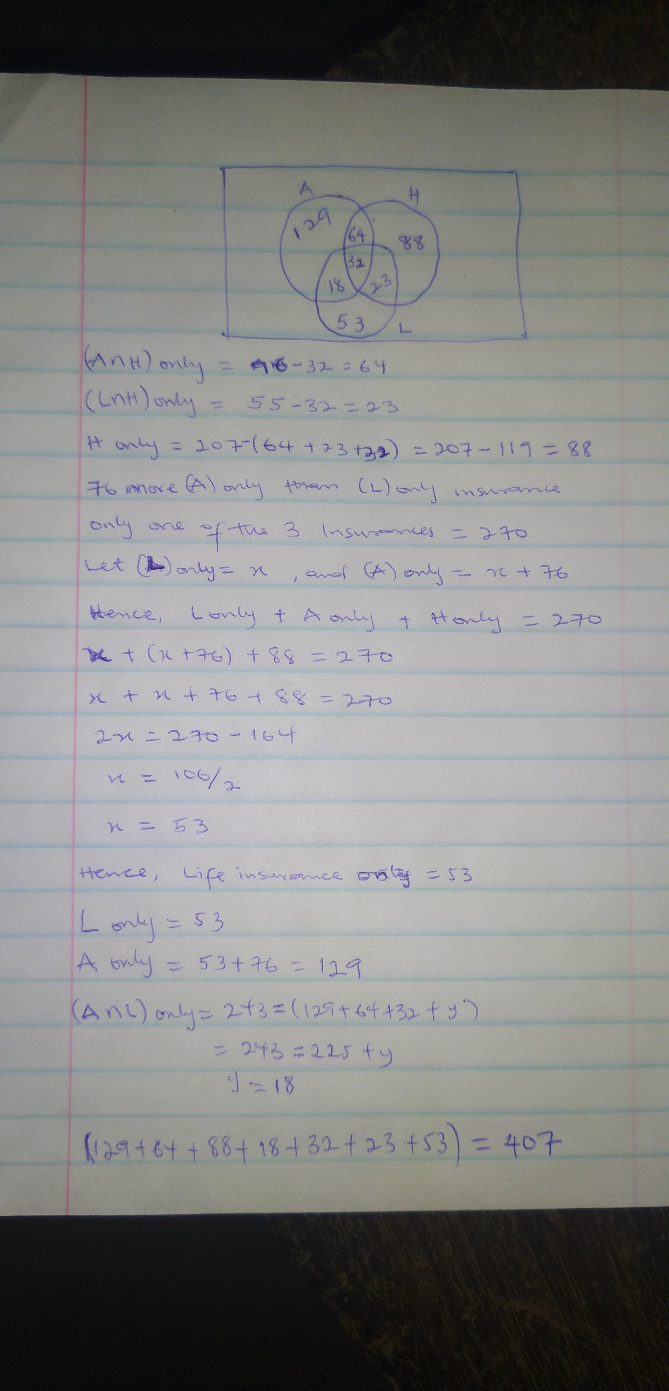 insurance. iii) 55 own life insurance and homeowner insurance. iv) 96 own auto insurance and homeowner insurance. v) 32 own life insurance, auto insurance and homeowner insurance. vi) 76 more clients own only auto insurance than only life insurance. vii) 270 own only one of these three insurance products. Calculate the total number of the agent’s policyholders who own at least one of these three insurance products.