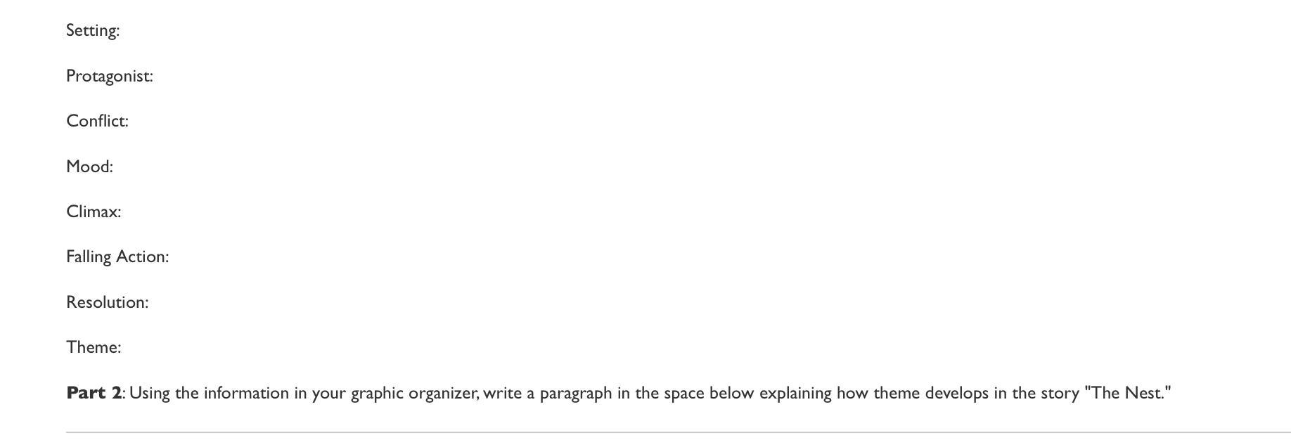 Theme: <em>The central topic or moral of the story. Can be stated directly or the reader may need to think of the main idea. </em>