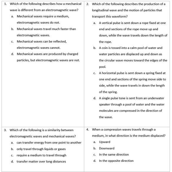 2) d) A single pulse tone is sent from an underwater speaker through a pool of water and the water molecules are compressed in the direction of the wave