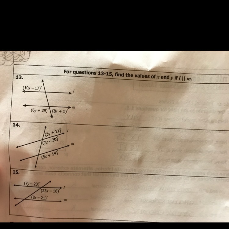 In problem 13, (10x-17) and (8x+1) are alternate exterior angles. They are both on the outside of the lines and on opposite sides. Alternate exterior angles are congruent which means they equal each other. So, you can set the two equations equal to each other, solve for x, the plug that value back in to the separate equations of each angle.