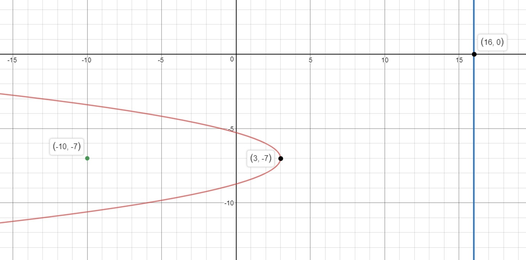 Half of this distance must be the distance from the focus to the vertex, so the vertex of the parabola is the point (3,-7).