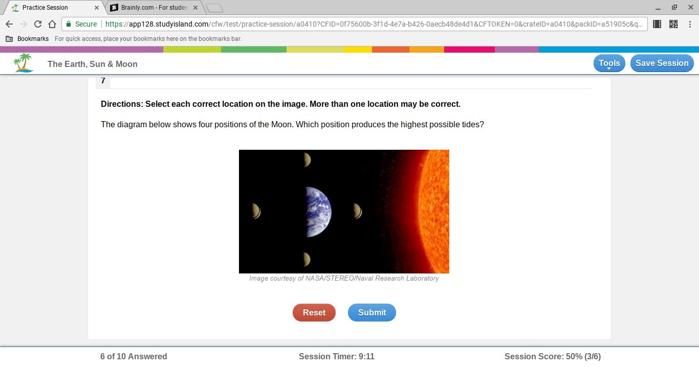 The diagram below shows four positions of the Moon. Which position produces the highest possible tides?
