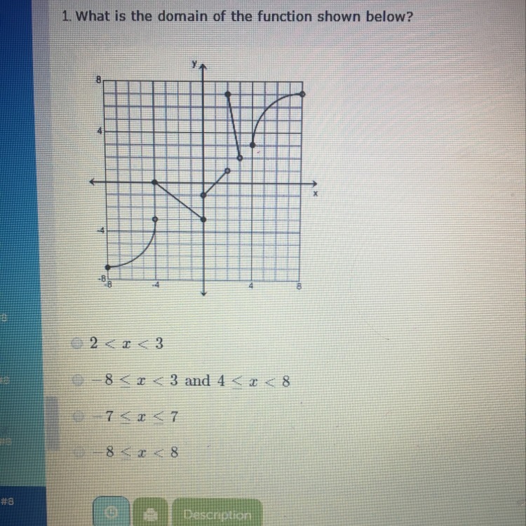 The domain is the horizontal extent of the function definition. Here, the function is defined between -8 and +8 with a hole between 3 and 4. The appropriate answer is the one that has two pieces. See the attachment.